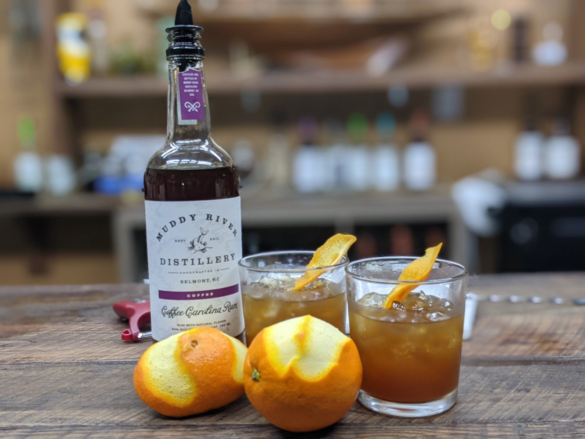I know that coffee and cider might not sound like the best combination, but when you try it, you will see why we made this. We used some great apple cider and mixed it with a little coffee from Javesca here in Charlotte. Then we added some of our awesome Muddy River Coffee Rum and a twist of orange peel on top. All of that together makes you think of fall!